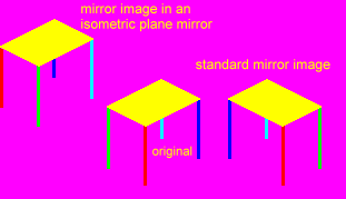 dear all, when you use the mirror image function of any pixel-based graphics software, you get a straight reversal in a 'mirror' perpendicular to the plane of the screen (see below right). is anyone aware of any software that can have a stab at reflection in an isometric plane mirror (see below top left)?
