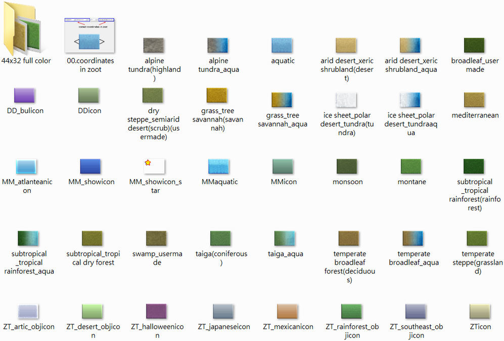 Description: Here are purchase menu icon backgrounds for various habitats and themes. The icons in the main folder are 45x32 with the first pixel of each row being the pixel to represent transparency, so that they can be used in Zoot and appear in ZT as 44x32. You would use a graphics program to add an image of your animal or object to the background and reduce the number of colors to 256, then use Zoot to load the icon and position the icon. The "00.coordinates in zoot.png" image shows what numbers to use in Zoot to adjust the position of the icon. The icons in the "44x32 full color" folder are the same icons, but without the pixels representing transparency. Zoot cannot handle those directly, but they might be useful for other tools or other purposes.