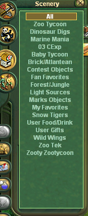 In addition to the original 7 user made entries, it adds another 8. Others can be added to it in the future. With the current combinedMenuFilterNames.ztd, the Menu Filter will show what is in the image. "03 CExp" was used by things in the ZA 2003 Christmas pack. "Baby Tycoon" was used by various "Baby Tycoon" packs at ZA, where young animals were used as adults. "Brick/Atlantean" is new. Eventually it is intended to include user made things that have a Brick, Atlantis, Atlantean, or Atlantia theme to them. "Contest Objects" is new. No released downloads will use that. For some contests, combined ".ztd" files are provided. When those are created they may be configured to be shown in "Contest Objects", allowing them to be found more easily. "Fan Favorites" is new. If people say they use a certain ".ztd" for many zoos, we will see if we can configure it to be in "Fan Favorites". "Forest/Jungle" is new. Eventually it is intended to include user made things that have a Forest, Jungle, or Rainforest theme to them. "Light Sources" is new. For things made or updated in the future, if it is an object that looks like it gives light, it could be configured to be in "Light Sources". This could include user made things such as campfires, candles, fire, flames, lamps, lanterns, lights, lighthouses, streetlights, and torches. "Marks Objects" was used by Mark Bell for some things he made. "My Favorites" is new. No released downloads will use that. This goes back to Mark Bell's original idea of letting people have an entry for their personal use. People that want to do this for personal use have to be comfortable with editing ".ucs", ".uca", ".ucb", and ".ai" files that are in ".ztd" files. They would add "myfav" to the [Member] section of those files for things they want in "My Favorites". "Snow Tigers" was used for some things made at ZA by the Snow Tigers group. "User Food/Drink" is new. For things made or updated in the future, if it sells food or drinks, it could be configured to be in "User Food/Drink". "User Gifts" is new. For things made or updated in the future, if it sells gifts or gives prizes to guests, it could be configured to be in "User Gifts". "Wild Wings" was used for things in RSN's Wild Wings pack. "Zoo Tek" was used for some old downloads at Zoo Tek. It was intended to be for some things that were only available at Zoo Tek. "Zooty Zootycoon" was used for some things at JBL's Zooty Zootycoon web site, which no longer exists.