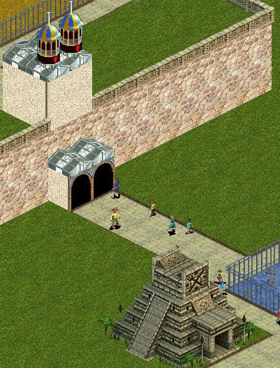 Description: These are elevators to allow guests to get onto and off of a cliff. They can be used together like the first screenshot shows, or they can be used with other things. Both are called Elevator in the purchase menu. The shorter building is meant to get guests up onto a cliff and is the building at the bottom of the cliff in the first screenshot. The taller building is meant to get guests down from a cliff. The back of that building is shown on the cliff in the first screenshot and the front of that building is shown in the second screenshot. Their purchase menu icons show "4" in green on the left side of the icon, which means that the guests will exit 4 tiles away from where they entered. Another way of looking at that is there must be exactly 3 tiles between the entrance tiles and the exit tiles. If that cliff was lowered to ground level, the 2 buildings would be back to back. Usually ZT will not have guests use the same type of entrance more than once. Since an Elevator for fun was used to get guests onto the cliff, ZT usually will not have guests use another Elevator for fun to get off the cliff. So in addition for fun, the Elevator on the cliff is also configured to have guests enter it when they get hungry. So there should be a restaurant near the Elevator on the ground. To indicate the Elevator on the cliff is to be used when guests get hungry, the front of that Elevator looks different, as is shown in the second screenshot. In this example, the cliff has an exhibit, gift cart, restroom, and a couple of benches. So guests can stay happy on the cliff until they get hungry and leave the cliff via the Elevator. There should not be food or drink on the cliff, so that the guests will eventually get hungry and use the Elevator to leave. A zookeeper should be assigned specifically to the exhibit so that they don't wander far. Otherwise ZT can have them leave the cliff, but not be able to get them back up. If the exhibit fences deteriorate, maintenance workers might have to be grabbed and put on the cliff manually. These elevators were made by Jay using some graphics from RCT2, and the down elevator also includes a graphic made by Makonix/argonath for RCT2.