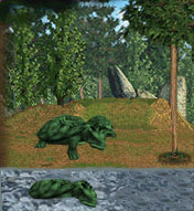 Description: This does not go in tanks. As the name suggests, this is one turtle that commands respect. When disturbed, the snapping turtle does not hesitate to defend itself, but will strike with amazing speed and force. Because it is a large animal, its powerful jaws are capable of tearing flesh quite badly. Why doesn't the snapping turtle protect itself by simply hiding in its shell? For good reason; it simply cannot fit! The snapping turtle normally has a shell length ranging from 8 - 18 1/2" and has a tail nearly as long as the shell. The tail has saw-toothed keels on it. The shell ranges in color from dark green to tan to dark brown and can even be black in some individuals. Snapping turtles have characteristic tubercles on their necks and legs. Plastrons of snapping turtles are very small and leave much of the extremities exposed. Adult snapping turtles may weigh as much as 70 lbs.
