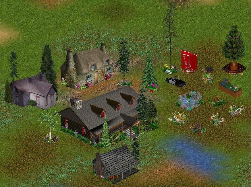 Included are several scenery buildings, decorative forest squares, decorative well, Charlie's police car, a mossy pond, two planters and a working shelter.
