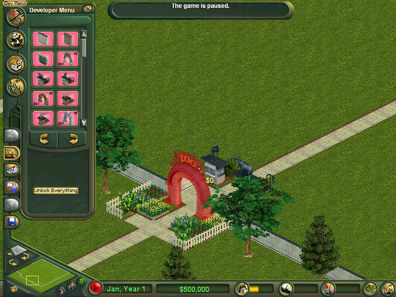 Description : By default, zoo entrances, zoo walls, and admission booths cannot be deleted, since that can cause Zoo Tycoon (ZT) to be confused about what is inside the zoo and what is outside the zoo. This hack allows those objects to be deleted and also adds icons for those objects in the Developer Menu. In order to allow adding those objects to zoos, the Developer Menu Hack must be used at the same time as this hack. These hacks will allow map makers to create new maps from existing maps. ZT will not allow zoo walls or objects outside of the zoo to be deleted right away. In order to do so, pause ZT, delete the zoo entrance, save the zoo, reload that saved zoo, and pause ZT again right away, so that zoo activity does not occur. To delete the zoo entrance in the expansion packs, you would click ZT's bulldozer icon and click the zoo entrance. But to delete the zoo entrance in the original ZT, you would click ZT's bulldozer icon and use its "drag" way of deleting to delete the zoo entrance (ie, click the bottom corner of the zoo entrance and, while continuing to press the mouse button, move the mouse far enough along the bottom of the zoo entrance to highlight the zoo entrance for deletion, then release the mouse button). When ZT loads a zoo, it looks for the position of the zoo entrance to determine what is inside the zoo and what is outside the zoo. When it does not find a zoo entrance, everything is considered inside the zoo, allowing the zoo walls and anything else to be deleted. With the zoo entrance deleted, zoo walls can be deleted and added wherever one wants, although there are some rules to follow. There should be zoo walls that go completely around what the zoo will be, excluding a 3 tile gap for the zoo entrance. For the zoo walls that go completely around the zoo, none of them must be on the edge of the map because there is a mistake in the expansion packs where that will eventually cause the expansion packs to crash when the map is used. The original ZT does not have this mistake. It is permitted to have zoo walls inside the zoo as well, and ZT comes with some maps that do so. But those zoo walls should not form any other loops, otherwise ZT will not know if they are inside or outside the main zoo. In addition to making adjustments to the zoo walls, one can also make adjustments to the objects and terrain that will be outside the zoo. It is recommended that no work is done for any exhibits or staff until after the zoo wall, admission booth, and zoo entrance work is complete. A zoo does not have to have admission booths and ZT comes with some maps that do not have them. They can probably be placed anywhere inside a zoo, although when ZT has them in maps, they are always relatively close to the zoo entrance, though they often are at different distances or different orientations. When all of the work is done for the zoo walls and what will be outside the zoo, add a zoo entrance to the 3 tile gap that was left in the outer zoo wall. The zoo entrance has to be oriented in the correct direction. The zoo entrance icons in the developer menu will help with that. Those zoo entrance icons show which side should be facing the outside of the zoo and which side should be facing inside the zoo. All of the map edges must be outside of the zoo for the expansion packs to work properly. There should be only 1 zoo entrance on the map. After adding the zoo entrance, you will usually want to click the zoo entrance and change the name of the zoo. Once the map entrance is in place, save the zoo, exit ZT, remove developerMapEditorHack.ztd from ZT's folders, restart ZT, and reload the zoo. You can now make any changes to the inside of the zoo, including using the Developer Menu if you want. It is theoretically possible to have user created zoo entrances, but they would have to use the same ID as ZT's zoo entrance and would have to be configured as a zoo entrance, including 2 different versions: 1 that allows it to be deleted by map makers and another that does not allow it to be deleted, which would be used by players using maps containing it. The Developer Map Editor does not allow placing food because ZT would not actually use those objects as food. Like any other saved game, any map created with the Developer Map Editor will know which version of ZT was used to create it. That means anyone using an earlier version of ZT will not be able to load that map. It is possible to change the version that is inside the ".zoo" file, but only do so if you are sure the map can be used in whatever version you set it to, and test well. To change the version, you also need to understand how to use hex or binary editors, since that is where the change would be made. The 5th byte in a ".zoo" file represents the version that created the ".zoo". The ZT beta uses a byte of 0; the original ZT uses the letter "F", DD uses the letter "R", MM and CC use the letter "j", and ZT made for computers other than PCs use lower case letters higher than "j". In order to see some of the messages for the Developer Map Editor, any version of lang999-override.dll is also needed.