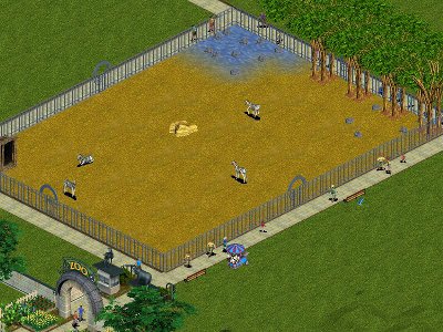Description : ZT allows us to purchase fences and, in the case of exhibits, allows us to say which piece is the gate. But ZT did not give us gates that we could purchase directly. The attached Iron Bar Gate is a gate that we can purchase directly. Unfortunately, ZT does not allow gates to be purchased from the Fences purchase menu. So I put the gate in the Scenery purchase menu instead. Its price is 180, just like the in-game Iron Bar Fence. Purchasing gates allows having an exhibit with more than 1 gate. The screenshot shows an exhibit with a gate in each of its 4 sides. The gates in the 2 rear sides are difficult to see, though, since the gates blend in with the grass terrain and trees. Other than for the looks, though, I do not see a use for this gate because of the silly way ZT assigns tasks to keepers. If something needs to be done in an exhibit, ZT does not have the keeper go do that task directly. Instead, it has the keeper go to a tile inside the exhibit that is near the main exhibit gate. Once the keeper gets there, then ZT tells the keeper what task to do. Similarly, when all tasks are done in the exhibit, ZT tells the keeper to go to the tile just outside the main exhibit gate. Although the screenshot shows 4 gates for the exhibit, only 1 of them is the main exhibit gate. So that is the one that will be used most of the time. However, if that gate gets blocked, the keepers will use the other gates, although they will still go to one of the tiles near the main exhibit gate before doing any tasks in the exhibit. When a keeper does use one of the other gates, it opens just like the main exhibit gate.