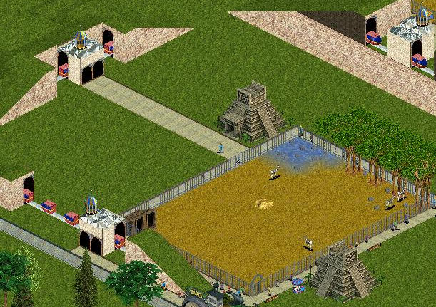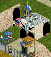Description: These are entrances to people mover types of rides. They can be put with certain types of people mover scenery to make it appear guests are using the people movers. Although they can be used with other types of people movers as well, the screenshots show them being used with the Elevated Monorail People Mover and Monorail People Mover On Ground scenery pieces. The layouts in the screenshots are examples, and many other layouts are possible. There are 6 mover entrances: 3 for elevated people movers and 3 for people movers on the ground. All 6 mover entrances have 2 entrances at ground level on the same side of the building. The first 3 screenshots show the 3 mover entrances for elevated people movers. The entrance in the first screenshot is configured as a Relaxing Ride where guests enter, use the people mover for 125 seconds, and exit where they entered. The purchase menu icon shows "125" in black on the right side. The second screenshot has 4 entrances that are configured as a Transportation Station, and have "55" and "125" on the purchase menu icon. The "125" in black on the right side of the icon indicates that guests will use the people mover for 125 seconds. The "55" in green on the left side of the icon means that the guests will exit 55 tiles away from where they entered. Another way of looking at that is there must be exactly 54 tiles between the entrance tiles and the exit tiles. A useful way to measure 54 tiles is to use Cricket's One Dollar Picket Fence. The entrance tiles have to be next to the entrances on the entrance building, and the entrance building should be between the entrance tiles and exit tiles in order to have the correct distance. The distance is about the distance to get across the length or across the width of ZT's "Basic Grass Map (Small)". In that second screenshot, guests can enter the building on the left side and exit on the other side of the center building in the top right. Guests can also enter that center building in the top right and exit at the building on the left side. Guests can also enter the building in the bottom right and exit the other side of the center building in the top left. Guests can also enter that center building in the top left and exit at the building in the bottom right. The third screenshot shows an entrance that is configured as a Transportation Station, and has "213" and "125" on its purchase menu icon. The "125" in black on the right side of the icon indicates that guests will use the people mover for 125 seconds. The "213" in green on the left side of the icon means that the guests will exit 213 tiles away from where they entered. Another way of looking at that is there must be exactly 212 tiles between the entrance tiles and the exit tiles. That distance is to get across the largest user made map, which is called enlarged5c.zoo. Because of how large that map is, the screenshot shows only a small part of the layout. It is best not to have so much empty space in the zoo like is shown in the screenshot because guests can become so hungry trying to get to a mover entrance elsewhere on the map that they will become unhappy for not seeing animals and decide to leave the zoo instead. When using any of these people mover entrances, guests can get hungry while being there for 125 seconds. So restaurants should be near all of the exits. The fourth screenshot has all 3 of the ground level mover entrances, each configured differently. The entrance at the top left is configured as a Relaxing Ride where guests enter, use the people mover for 125 seconds, and exit where they entered. The purchase menu icon shows "125" in black on the right side. The entrance at the bottom left is configured as a Transportation Station, and has "30" and "70" on its purchase menu icon. The "70" in black on the right side of the icon indicates that guests will use the people mover for 70 seconds. The "30" in green on the left side of the icon means that the guests will exit 30 tiles away from where they entered. Another way of looking at that is there must be exactly 29 tiles between the entrance tiles and the exit tiles. Guests can enter the building on the bottom left and exit on the other side of the building in the top right, which happens to be on a cliff in this layout. The building in the top right is configured as a Transportation Station, and has "30" and "70" on its purchase menu icon. Beneath the "70" is a down arrow in red. That means the station is meant to be on cliffs. Usually ZT will not have guests use the same type of entrance more than once. Since a Transportation Station for fun was used to get guests onto the cliff, ZT usually will not have guests use another Transportation Station for fun to get off the cliff. So in addition for fun, the Transportation Station on the cliff is also configured to have guests enter it when they get hungry. So there should be a restaurant near the Transportation Station on the ground. To indicate the Station on the cliff is to be used when guests get hungry, the front of the Station looks different, as is shown in the fifth screenshot. In this example, the cliff has an exhibit, gift cart, restroom, and a couple of benches. So guests can stay happy on the cliff until they get hungry and leave the cliff via the Station. There should not be food or drink on the cliff, so that the guests will eventually get hungry and use the Station to leave. A zookeeper should be assigned specifically to the exhibit so that they don't wander far. Otherwise ZT can have them leave the cliff, but not be able to get them back up. If the exhibit fences deteriorate, maintenance workers might have to be grabbed and put on the cliff manually. Although other layouts can be used, the layout in the fourth screenshot makes it look like the monorail people mover goes underground by using slopes. But this layout is not perfect because of a ZT graphics glitch. The sixth screenshot shows the glitch. In 1 ZT view, ZT makes it loo